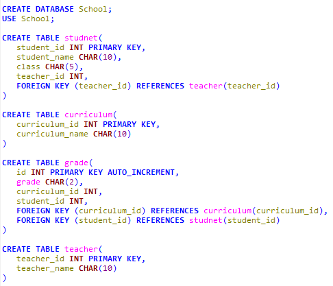 - student테이블의 참조 칼럼인 teacher_id에 SET DEFAULT NULL을 줘야할 것 같았다. (이건 긴가민가하다) 왜냐하면 선생님이 다른 학교로 가거나 그만두게 되면 DB에서 삭제해야한다. 그러면 학생도 함께 삭제 하는 게 아니라, 담당 선생님의 데이터만 NULL로 바꾸면 될 것 같았다.