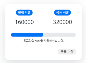 단순하게 Math.ceil((현재 지출의 합계)/(목표 지출))*100을 하면 어느 정도 사용 되었는지, Progress Bar에 표현할 수 있다.
