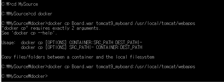 로컬에 있는 WAR 파일을 아래와 커맨드를 이용해 컨테이너 안으로 이동시킨다.
