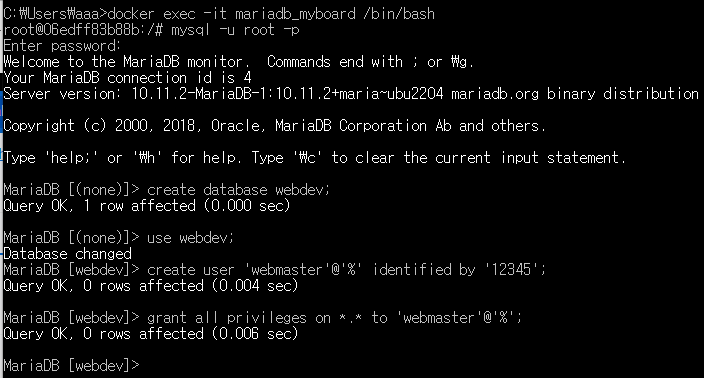 이 때, mariadb container의 터미널 창에 접속하기 위해서 아래와 같은 명령어를 적어준다.