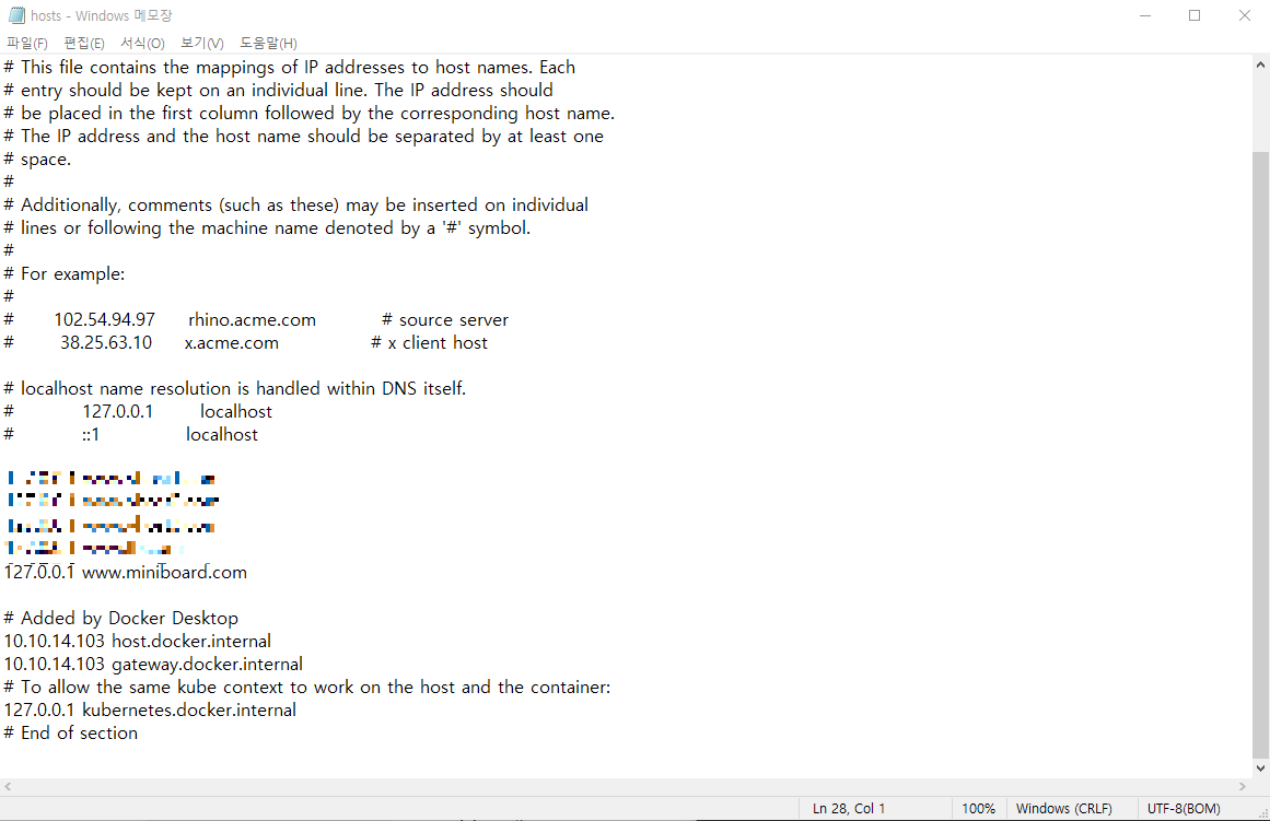 애초에 apache2 컨테이너를 생성할 때, 환경변수로 VIRTUAL_HOST=www.miniboard.com 설정했었기 때문에 로컬에서 www.miniboard.com으로 접속하기 위해서 127.0.0.1 www.miniboard.com 으로 설정해주었다. (위에 있는 다른 dns는 무시해도 됨)
