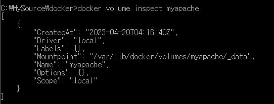 볼륨의 상세 정보를 보기 위해 inspect 명령어를 이용해준다.