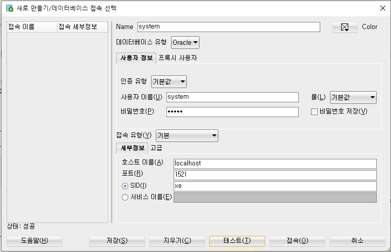 그리하여, 사용자 이름으로는 system을 적어주고, 비밀번호는 Oracle을 설치했을 때 설정했던 비밀번호를 적어준다.