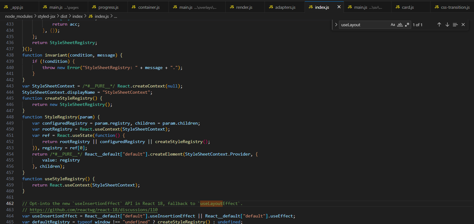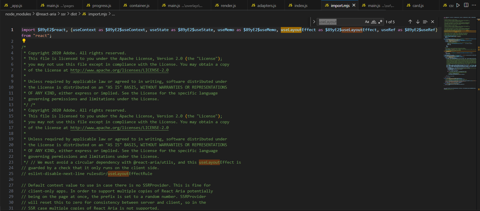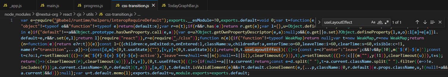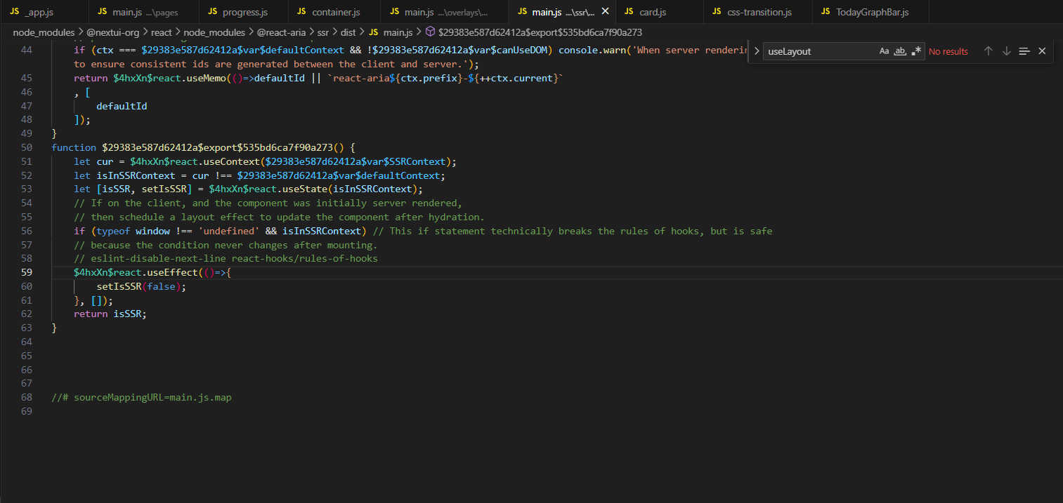 안 됨 . 다른 게시물들 보면 다들 이렇게 해서 해결했는데, 당연하게도 그 분들은 NextUI 안 씀ㅋㅋㅋㅋㅋㅋㅋㅋㅋㅋㅋ 오류메시지를 다시 천천히 보니까(특히 progress.js) 이건 NextUI의 문제인 것 같았다. 일단은 useLayoutEffect때문에 오류가 나는 건 알겠는데, 내가 쓴 코드에는 useLayoutEffect가 없는 걸 보니 NextUI 라이브러리 안에서 useLayoutEffect가 있는 모양이다. 그래서 일단은 정말 useLayoutEffect가 라이브러리에 있는지 확인해보았다.