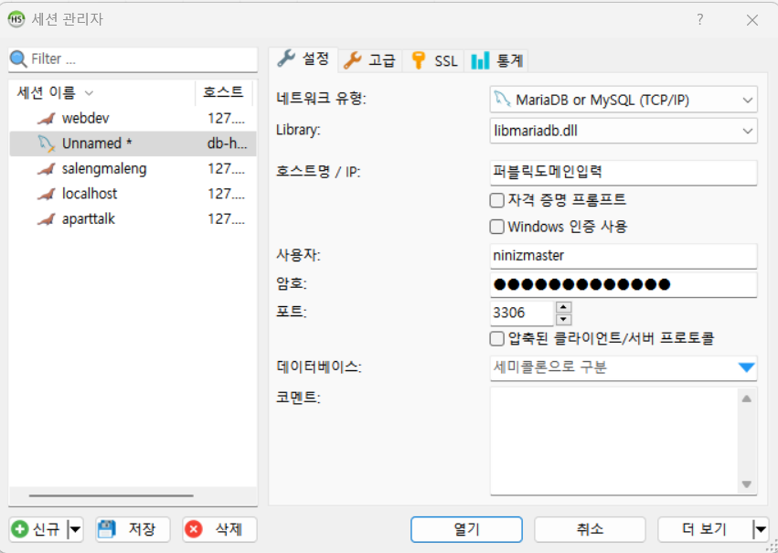 위와 같이 정보들을 입력하면 네이버 클라우드 DB 서버 접속 완료!! 개쉽다 진짜
