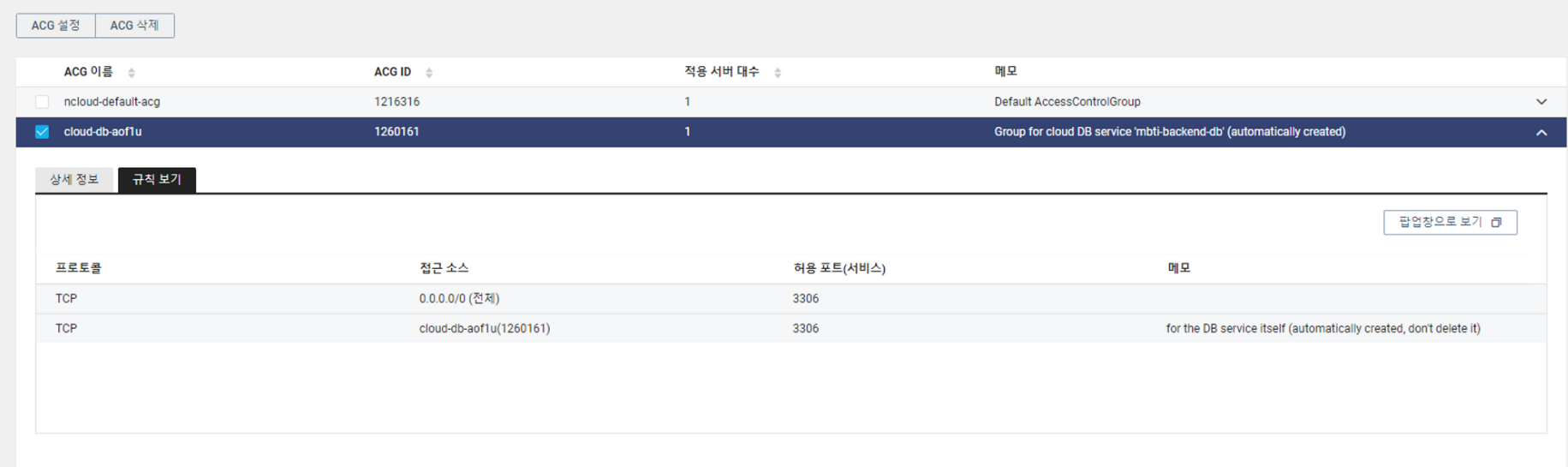 ACG를 누르면 아래와 같이 뜨는데, ACG 설정을 눌러서 설정해준다. 참고로 나는 다른 사람들도 같이 써야해서 또 접근 소스를 0.0.0.0으로 설정해주었다.