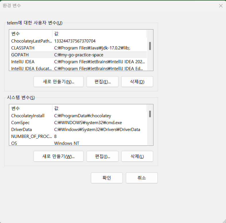 가서 보면 GOPATH가 미리 설정 되어있는 것을 볼 수 있다.(Go 설치 했을 때 자동으로 Path 설정을 해줌)