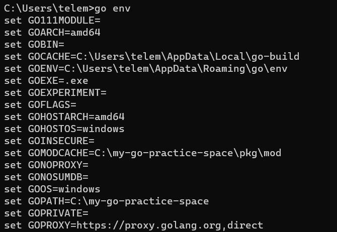 위와 같이 방금 만든 디렉토리를 GOPATH로 설정해주고, 터미널에서 go env를 입력해 GOPATH가 시스템 변수로 잘 설정되었는지 확인해본다. (일단 난 잘 설정됨)
