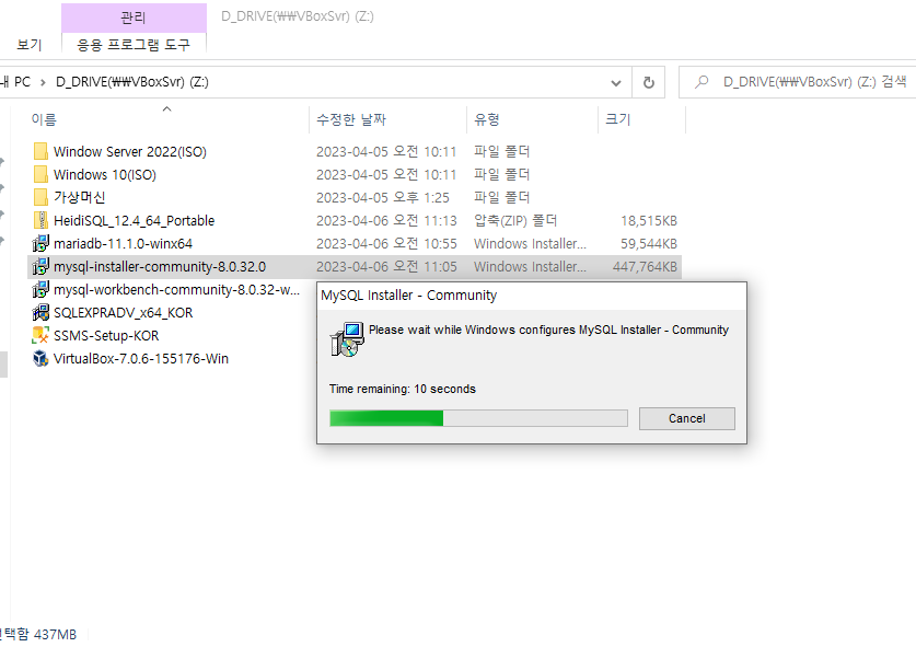 6) 난 마운트한 공유 폴더에 있는 mysql-installer를 실행시켜줬다. (이게 싫으면 4번 과정을 생략하고 그냥 가상머신에서 다운 받고 설치해도 상관없다!! 그래도 나중에를 위해 4번 과정을 꼭 해줘야한다.)
