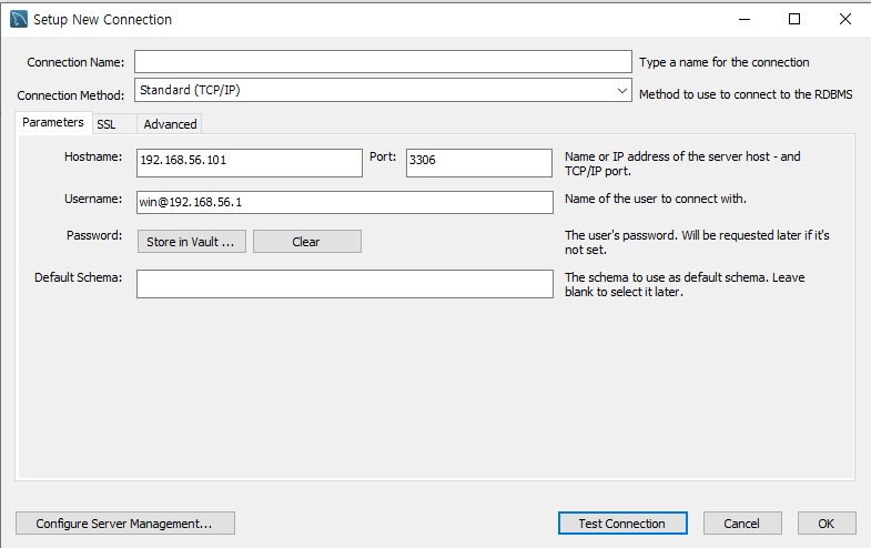 22) WorkBench를 깔아주고(까는 과정은 생략한다), WorkBench에 접속하면 + 아이콘이 매우 작게 있다. 그걸 누르면 위와 같은 창이 뜨는데, Hostname에는 VM의 IP를 적어주고(CMD에서 ipconfig를 눌러 ipv4 확인), Username과 Password는 우리가 쿼리 문으로 작성한 것과 똑같이 적어준다.