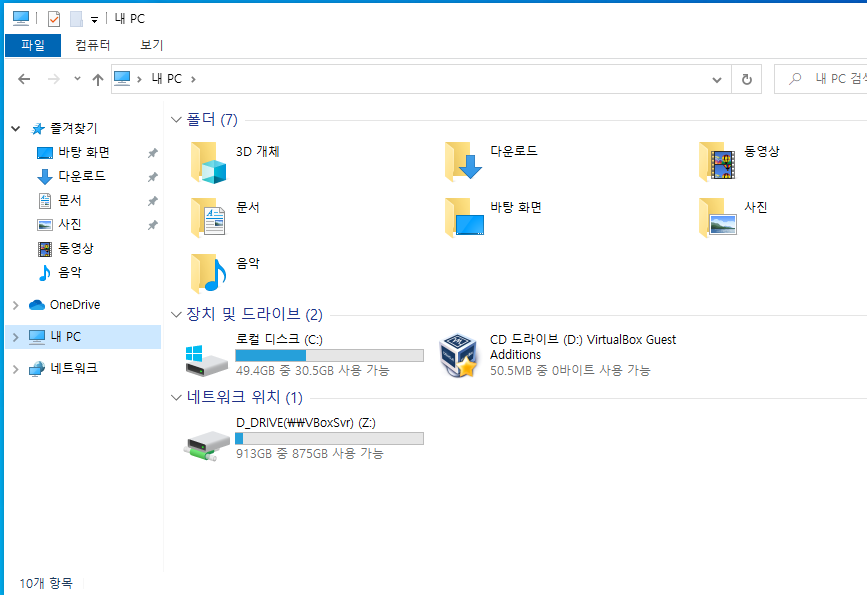 5) 위의 작업을 마치면 가상머신의 파일 탐색기에서 내가 공유한 폴더가 네트워크 위치 탭에 추가 되어있음을 확인할 수 있다.
