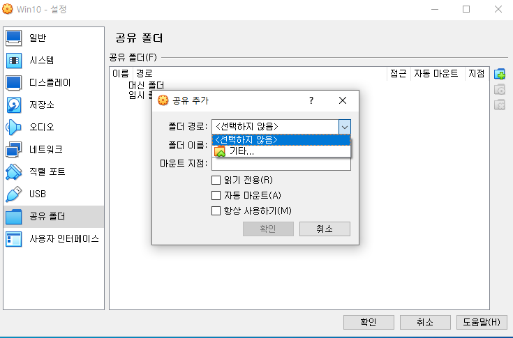 3)공유 추가에서 기타를 눌러 자신이 공유하고자 하는 폴더를 선택한다. 이 때, 딱히 가상머신에서 마운트 하고자 하는 폴더가 없다면 자동 마운트를 체크 하고, 편의를 위해 항상 사용하기를 누른다. 나는 호스트 컴퓨터에서 MySQL installer가 깔려 있는 폴더에 마운트했다.