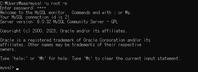 17) 이제 CMD 창을 열고 mysql -u root -p를 쳐서 root 계정의 비밀번호를 적어주면 mysql cmd 접속 완료!! 그렇지만 우리는 유저 계정을 만들어야 한다.