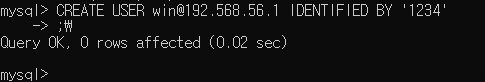 18) CREATE USER '유저이름'@'유저IP주소' IDENTIFIED BY '비밀번호' 쿼리를 적어준다. 이 때, 모든 IP 상관없이 들어오게 하고 싶다면 CREATE USER '유저이름'@'%' IDENTIFIED BY '비밀번호'라고 적어주면 된다 @뒤에 '%'를 꼭 적어줘야 된다. (따옴표 포함해서 쳐야함)